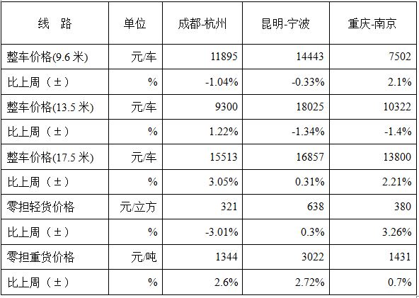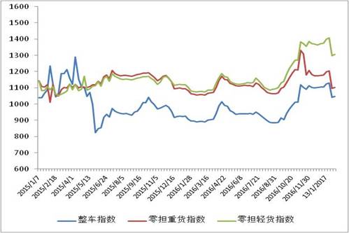 各车型指数环比均有不同程度回升,其中零担轻货指数回升幅度高于整车指数、零担重货指数。其中,整车指数为1046.2点,环比回升0.57%,比上年同期增长17.5%;零担轻货指数为1304.5点,环比回落0.62%;零担重货指数为1103.5点,环比回落0.54%。