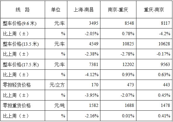 表1 本周部分线路平均价格及环比情况对比