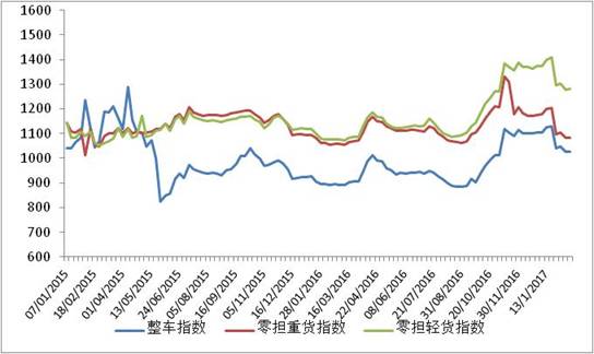 各车型指数环比均有不同程度回升,其中零担轻货指数回升幅度高于整车指数、零担重货指数。其中,整车指数为1027.43点,环比回升0.18%,但比上年同期增长14.7%;零担轻货指数为1278.58点,环比回升1.98%;零担重货指数为1082.32点,环比回升1.92%。