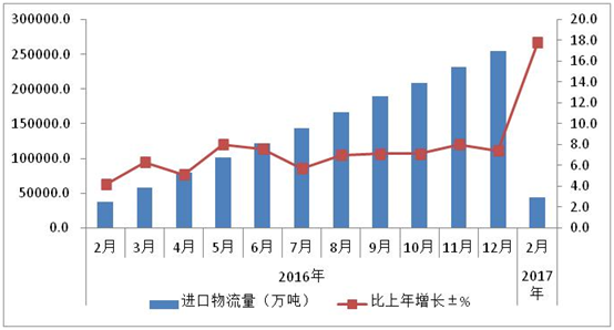 图 2 2017年进口物流量及增长变化情况