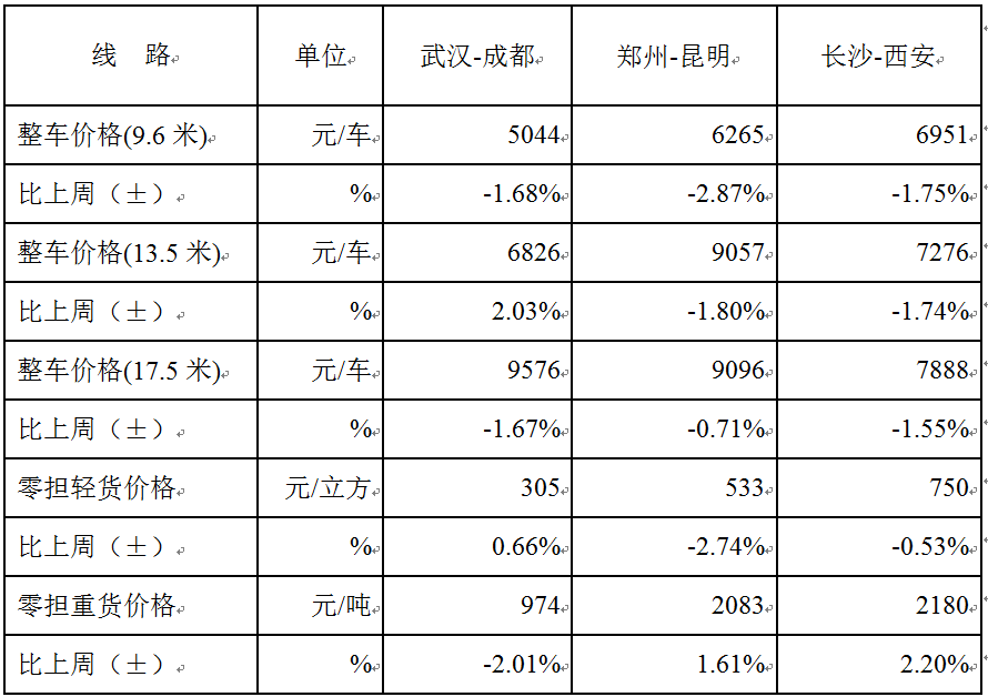 本周,公路物流需求总体平稳,公路运输市场运力供给持续增长,公路价格指数连续三周环比回落走势,但仍高于上年同期水平。从后期走势看,公路运输市场需求有望保持平稳的发展态势,但运价指数可能延续震荡走势。