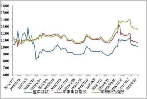 各车型指数环比均有不同程度回落,零担指数回落幅度高于整车指数,零担轻货指数高于零担轻货指数。其中,整车指数为1010.2点,环比回落0.61%,但仍比上年同期增长11.7%;零担轻货指数为1257. 6点,环比回落0.76%;零担重货指数为1064.0点,环比回落0.66%。
