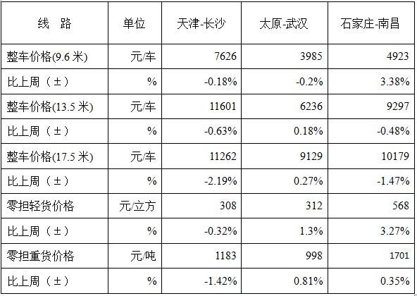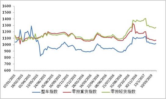 各车型指数环比均有不同程度回升,零担指数回升幅度高于整车指数,零担重货指数高于零担轻货指数。其中,整车指数为1017.22点,环比回升0.69%,比上年同期增长12.1%;零担轻货指数为1267.0 点,环比回升0.75%;零担重货指数为1072.11点,环比回升0.76%。