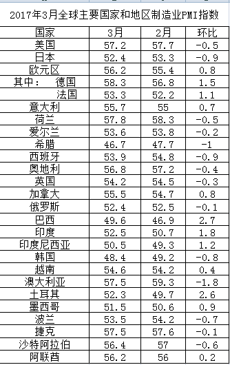 2017年3月全球主要国家和地区制造业PMI指数