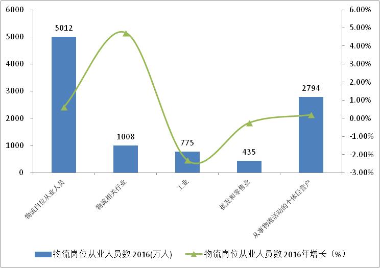 统计调查测算,2016年末,我国物流岗位从业人员数为5012万人,比上年增长0.6%,占全国就业人员6.5%。