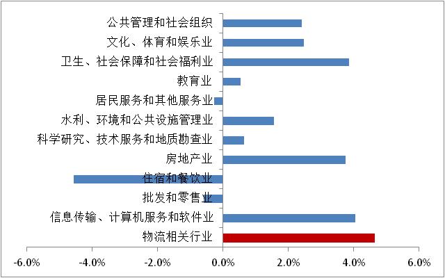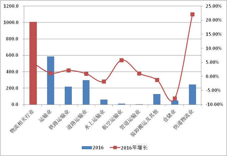 2016年末物流与主要服务业行业增长情况对比(单位: %)