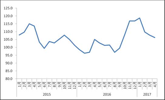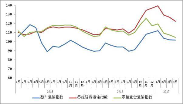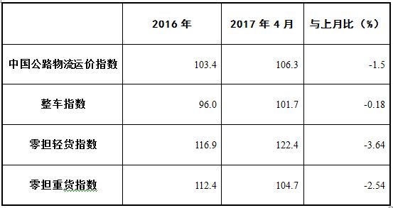 和林安物流集团联合调查的中国公路物流运价指数2017年4月为106.3点,比上月回落1.5%,运价指数连续三个月环比回落。
