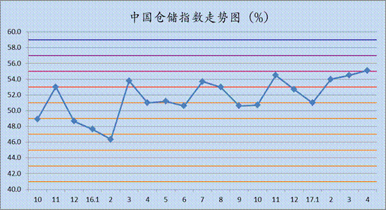 雷竞技电竞竞猜网 与中储发展股份有限公司联合调查的2017年4月中国仓储指数为55.1%,较上月回升0.6个百分点,连续十四个月位于扩张区间。各分项指数中,设施利用率指数、收费价格指数、主营业务成本指数、期末库存指数及企业员工指数较上月有所回升,其余指数均有不同程度的回落。