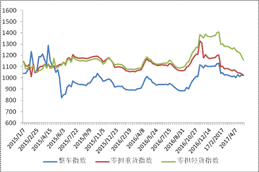 各车型指数均有不同程度回落。其中,零担指数回落幅度高于整车指数指数。在零担指数中,零担轻货指数回落幅度明显高于零担重货指数。本周,整车指数为1022.6点,环比回落0.3%,比年初回落7.4%;零担轻货指数为1160.1点,环比回落2.9%;零担重货指数为1021.7点,环比回落1.6%。