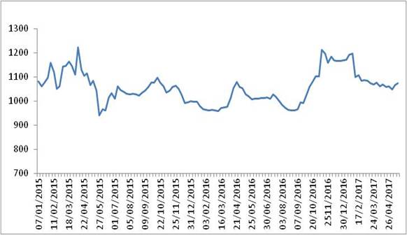 图 1 2015-2017年各周中国公路物流运价指数