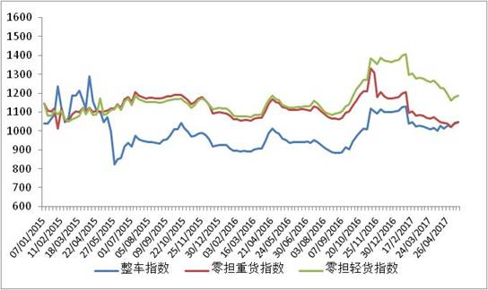 各车型指数环比均有不同程度回升,整车指数回升幅度高于零担指数,在零担指数中零担重货指数回升幅度高于零担轻货指数。其中,整车指数为1048.1点,环比回升0.72%,比上年同期增长10.2%;零担轻货指数为1188.1点,环比回升0.59%;零担重货指数为1047.8点,环比回升0.62%。