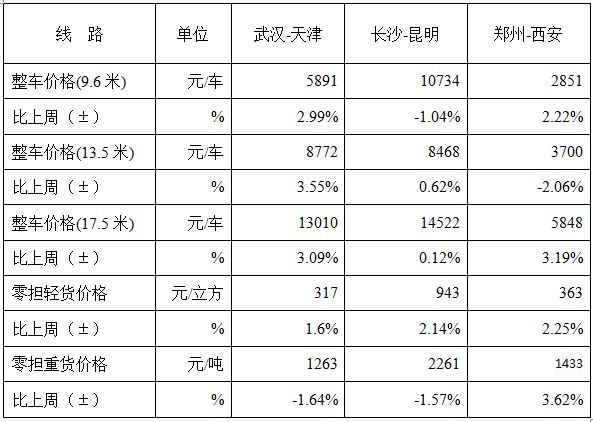 表1 本周部分线路平均价格及环比情况对比