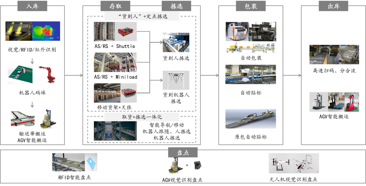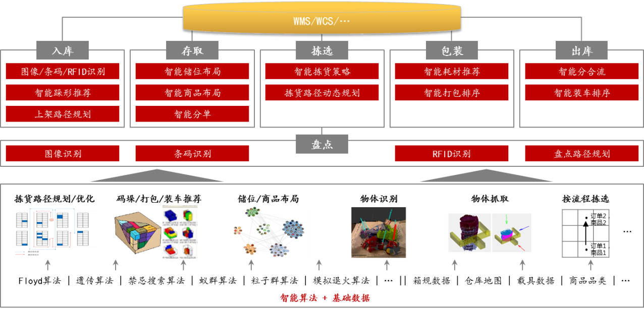 (1)仓储。基于仓库、商品、订单、波次等基础数据,未来将会实现入库、存取、拣选、包装、出库和盘点环节中各项作业的智能调度。