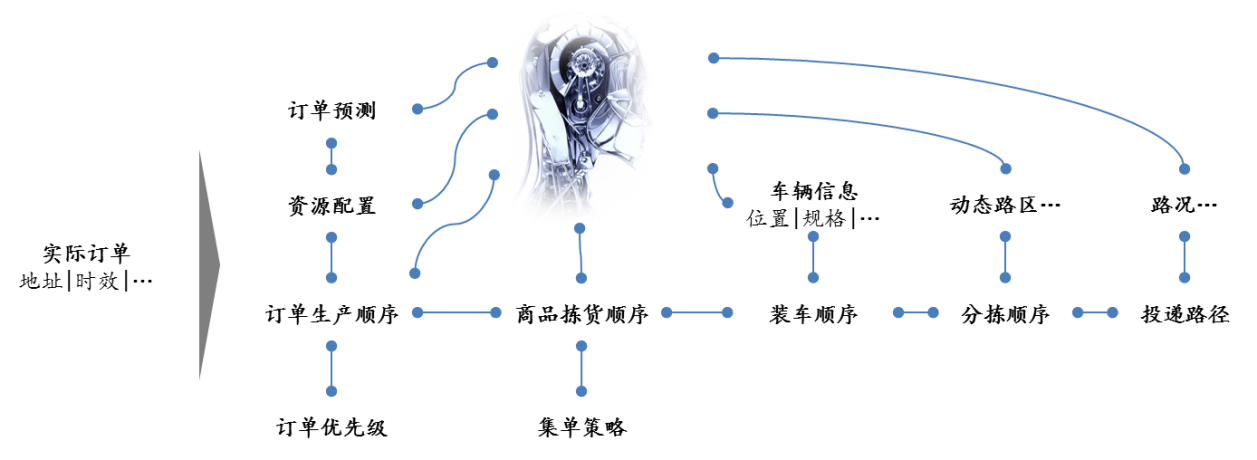 以智能路由推荐和动态分拣为例:在运输环节,根据商品件型、货物重量和体积、商家地址以及目的地址等信息,由系统利用历史数据及智能算法,匹配出相应规格的上门接货车辆,并生成运输路由。并且,能根据实际情况,实时动态调整路由,当到达中转站出现延误时,系统自动推荐新的后续路线。在配送环节,根据各分拣中心的产能和负荷情况,系统动态调整分拣中心覆盖的路区,使各分拣中心负荷更加均衡,避免忙闲不均,影响部分订单的配送时效。