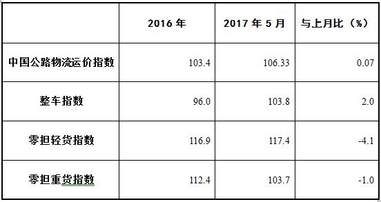 和林安物流集团联合调查的中国公路物流运价指数2017年5月为106.33点,运价指数在连续三个月回落后止跌回升,环比回升0.07%。