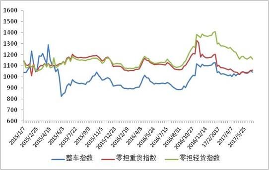 各车型指数环比涨跌不一,零担重货指数环比回升,零担轻货、整车指数环比回落。其中,整车指数为1043.5点,环比回落1.36%,比上年同期增长10.88%;零担轻货指数为1160.5点,环比回落1.75%;零担重货指数为1059.82点,环比回升0.17%,连续三周回升较为明显。