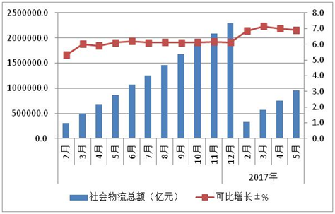 ----工业品物流需求保持稳定增长。1-5月工业品物流总额,按可比价格计算,同比增长6.7%,增速比上年同期加0.8个百分点,比年初回升0.4个百分点,与1-4月持平。