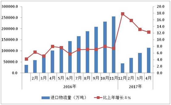 ---进口物流需求保持较快增长。1-5月进口物流总额同比增长12.3%,增速比上年同期提高4.3个百分点,连续四个月保持10%以上增长,但比1-4月小幅回落0.8个百分点。