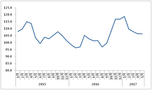 公路运输价格震荡回升。5月中国公路物流运价指数为106.33点,运价指数在连续三个月回落后止跌回升,环比回升0.07%。从月内各周指数看,第一、四周环比回落 ,二、三周则连续回升。综合来看,5月指数在前期持续回落后有所回稳,总体仍高于上年同期水平,1-5月平均指数为109.8点,比上年同期增长11.5%。短期看,公路物流供大于求的局面有所缓和。