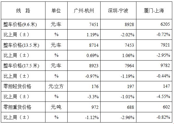 各车型指数波动幅度较小但均有同程度回落,零担指数回落幅度高于整车指数。其中,整车指数为1010.66点,比上周回落1.54%,比上年同期增长14.13%;零担轻货指数为1108.79点,环比回落1.65%;零担重货指数为1023.93点,环比回落1.87 %。