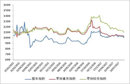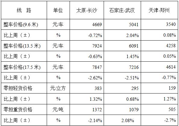 各车型指数波动幅度较小但均有同程度回落,零担指数回落幅度略高于整车指数。其中,整车指数为1002.94点,比上周回落0.76%,比上年同期增长13.25%;零担轻货指数为1099.12点,环比回落0.87%;零担重货指数为1016.28点,环比回落0.76 %。