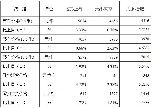 各车型指数波动幅度较小但均有不同程度回升,零担重货指数回升幅度略高于其他指数。其中,整车指数为1021.56点,比上周回升2.74%,比上年同期增长2.84%;零担轻货指数为1115.67点,环比回升2.45%;零担重货指数为1040.06点,环比回升2.88%。