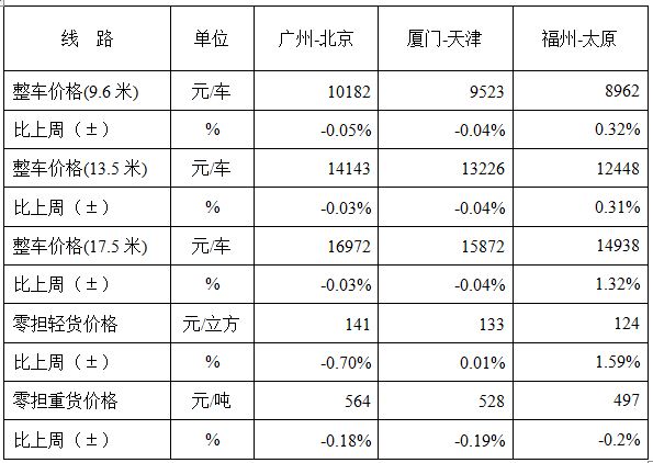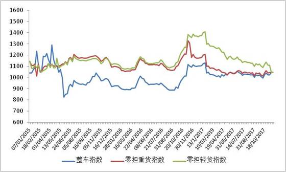 各车型指数涨跌不一,整车指数、零担轻货指数环比回升,零担重货数环比回落。其中,整车指数为1046.95点,比上周回升0.01%;零担轻货指数为1046.04点,环比回升0.1%;零担重货指数为1045.02点,环比回落0.03%。