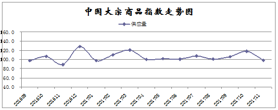 11月份,大宗商品供应指数为98.2%,时隔九个月以后,商品供应量再度出现环比减少的局面,显示随着北方限产的全面铺开,钢铁、有色金属、煤炭等生产企业开工率逐步下降,市场供应明显减少。各主要商品中,除铁矿石、汽车供应有所增长外,其余品种均呈现减少的态势,且汽车供应增速明显减缓。