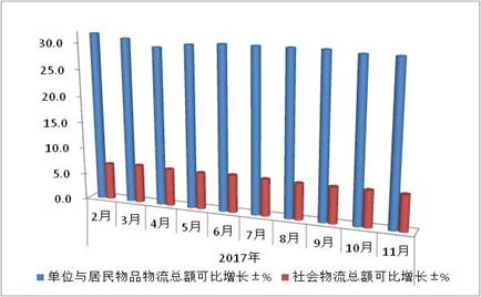 物流需求结构优化。1-11月,全国社会物流总额为229.9万亿元,按可比价格计算,同比增长6.7%,增速比1-10月回落0.1个百分点。从构成看,消费相关物流需求增势良好。单位与居民物品物流总额同比增速仍保持在30.3%的高速增长。