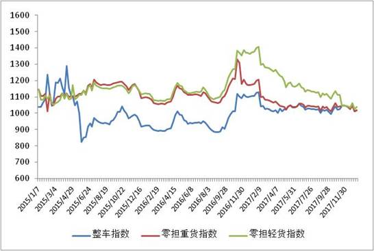 各车型指数均有不同程度回升,其中零担轻货指数回升幅度高于其他指数,零担重货指数回升幅度将对较低。其中,整车指数为1018.68点,比上周回升0.64%;零担轻货指数为1039.46点,环比回升1.32%;零担重货指数为1016.82点,环比回升0.61%。