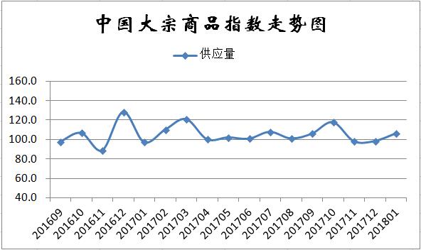 2018年1月份,大宗商品供应指数为106.2%,较上月回升7.8个百分点,时隔两个月后再现上升趋势。从数据的变化情况来看,虽北方地区环保限产严格,但当前企业生产利润仍处高位,加之年底部分大型企业在为完成生产目标而追量,近期国内大宗商品供应明显增加。各主要商品中,除铁矿石供应继续减少外,其余品种均呈现增长态势,特别是钢铁供应止跌回升。