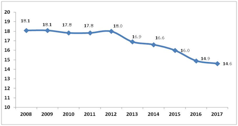 图 1 2008-2017年社会物流总费用与GDP的比率(单位:%)