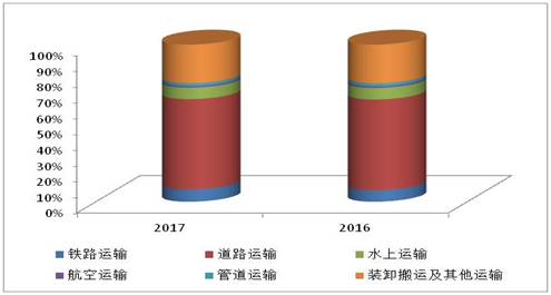 运输物流效率稳中有升。一是运输物流协调性增强。2017年,各种运输方式互联互通取得进展,运输费用占GDP的比率为7.99%,比上年下降0.02个百分点。其中,铁路运输持续高位运行,航空货邮运量增速提高,水运及港口货物和集装箱吞吐量保持平稳增长,多式联运、甩挂运输、江海直达运输等加快发展,主要港口集装箱铁水联运量增长超过10%,装卸搬运费用占比连续两年小幅回落,比上年下降0.1个百分点。