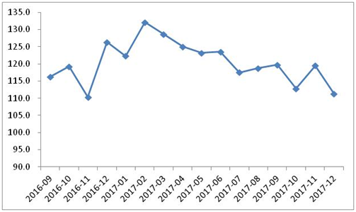 二是运输物流时效持续提升。简政放权、信息化应用、交通运输基础设施建等多举措带动下,运输环节时效持续提升。特别是电商物流等重点领域持续高效运行,2017年物流时效指数平均为121.2点,比上年提高6.4点。