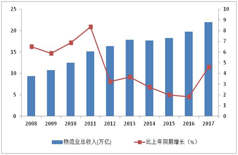 一是物流专业化提升,市场规模持续扩大。2017年物流专业化水平持续提升,物流市场规模加速扩张。全年物流业总收入为8.8万亿元,比上年增长11.5%,增速提高6.9个百分点。从细分市场来看,与产业升级相关的物流细分行业增势良好,冷链市场规模预计仍将超过20%,快递服务企业业务收入比上年增长24.7%,增速均高于物流业平均水平。