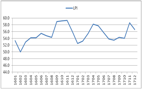 二是物流业景气状况良好,企业经营状况改善。物流企业业务需求旺盛,运营效率稳中提升,物流业整体呈现活跃态势,物流业景气状况处于近年来较高水平。2017年中国物流景气指数平均为55.3%,比2016年均值高出0.1个百分点, 11月回升至58.6%,为今年以来最高水平,12月份为56.6%,指数有所回落但仍处于55%的高景气区间。