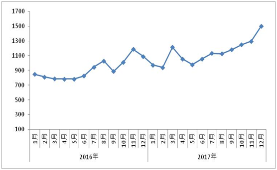 二是水运价格连续上涨,显著回升。2017年,海运运力供给过剩情况有所改善,大宗商品需求的不断上升,市场运行态势良好,价格显著回升。其中,上半年价格震荡波动,进入下半年则显著回升,价格指数连续5个月上涨,回升幅度不断扩大,12月中国沿海散货运价指数升至1500.83点,为近五年来的最高水平。全年平均为1148点,比2016年回升25.1%。