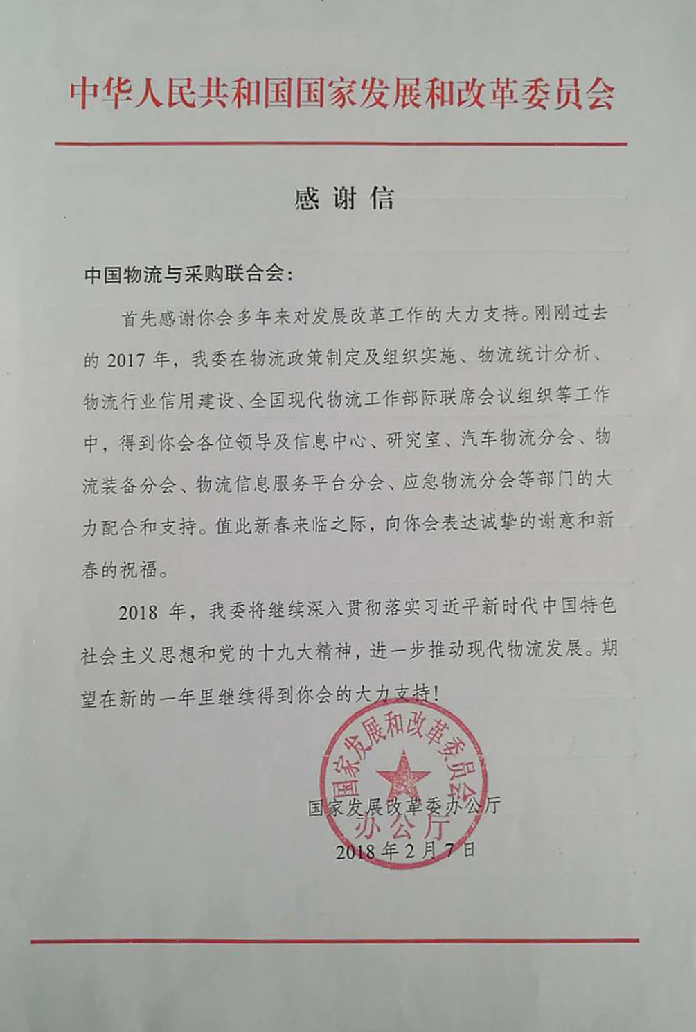 首先感谢你会多年来对发展改革工作的大力支持。刚刚过去的2017年,我委在物流政策制定及组织实施、物流统计分析、物流行业信用建设、全国现代物流工作部际联席会议组织等工作中,得到你会各位领导及信息中心、研究室、汽车物流分会、物流装备分会、物流信息服务平台分会、应急物流分会等部门的大力配合和支持。值此新春来临之际,向你会表达诚挚的谢意和新春的祝福。