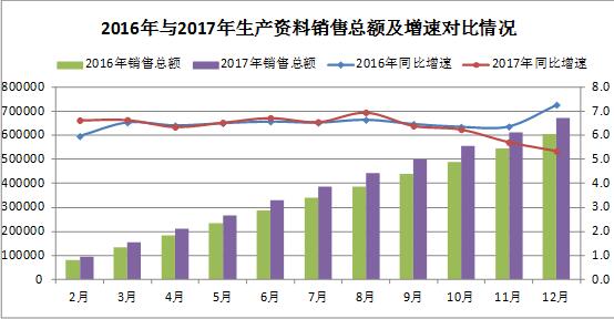 2017年,经济增速稳中趋升,经济发展的平衡性增强、效益提高、协同性改善。制造业PMI指数一直保持在51%以上,全年平均值为51.6%,高于上年1.3个百分点;整体走势平稳,波动较小,各月同均值水平的离差基本上在0.5个百分点之内。供需平衡增长,企业生产经营形势良好。在宏观经济和制造业运行稳中向好态势的带动下,生产资料市场销售状况保持良好发展态势。据初步估算,2017年全年生产资料销售总额达到67.3万亿元,可比价同比增长5.3%,较上年同期收窄2个百分点。从全年走势来看,前三季度增速保持平稳,第四季度受上年末基数较高影响有小幅下滑。