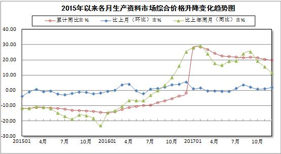 下半年,生产资料市场运行中的有利因素较多。一是外部环境相对较好,世界经济保持温和复苏态势,力度、广度和稳定性好于往年。美元指数低位震荡,也利好生产资料价格。二是市场需求淡季不淡,商品销售情况良好。三是成本上涨导致供应增长放缓。四是产销衔接正常,库存压力有所缓解。因此,市场价格结束之前连续四个月小幅回落的走势,下半年呈现持续上涨的走势。7月份止跌反弹,环比回升1.3%。8-9月连续上涨,分别回升3.6%、2.2%。特别是钢铁、有色金属行业受环保督查、新排污标准、地条钢清理、螺纹生产许可证核查等因素影响,供应收缩,价格环比上涨幅度较为明显。钢材、有色金属价格8月份环比分别上涨8.6%和8.3%。进入四季度,市场需求继续回暖,采购、生产等经营活动积极。但随着产量的持续增长,库存开始积聚,供应压力有所加大。市场价格继续上涨,但上涨速度略有放缓,市场价格过快上涨的局面有所缓解。10-12月市场平均价格分别上涨0.9%、1.1%和2.0%。