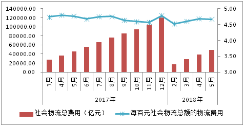 从社会物流运行看,1-5月社会物流总费用为4.9万亿元,同比增长7.5%,比上年同期回落1.9个百分点。每百元社会物流总额花费的社会物流总费用为4.67,比上年同期下降2%,比1-4月下降0.4%。