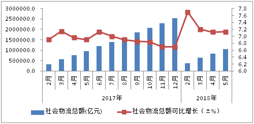 1-5月,全国社会物流总额105.3万亿元,按可比价格计算,同比增长7.1%,增速与1-4月持平,但比上年同期提高0.2个百分点。综合来看,物流需求增势总体平稳,物流运行保持了稳中有进的发展态势。