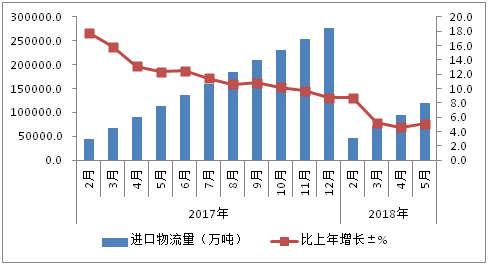 图表 2 2017-2018年进口物流量及增长变化情况