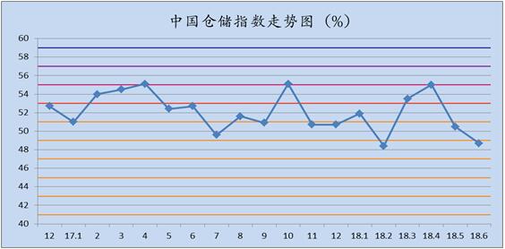 与中储发展股份有限公司联合调查的2018年6月中国仓储指数为48.7%,较上月回落1.8个百分点,时隔三个月再次回落至收缩区间。各分项指数中,收费价格指数与上月持平,延伸业务量指数、主营业务成本指数及期末库存指数较上月有所回升,其余指数均有不同程度的回落。