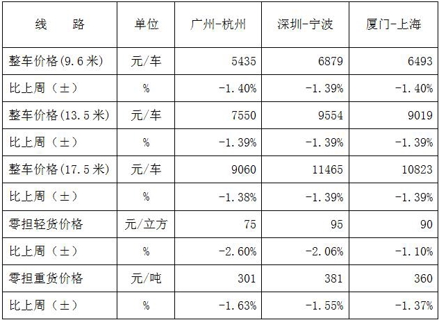 本周整车指数为956.78点,比上周回落1.39%;零担重货指数为956.62点,比上周回落1.40%;零担轻货指数为931.42点,比上周回落1.42%。