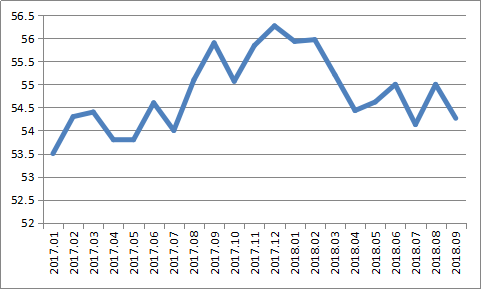 2018年9月份,欧洲制造业PMI为52.8%,连续两个月环比回落,本月回落1个百分点,降幅较上月扩大0.6个百分点。三季度,欧洲制造业PMI均值为53.6%,较二季度和一季度分别回落1个百分点和3.5个百分点。