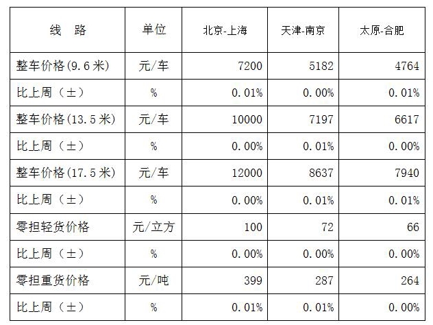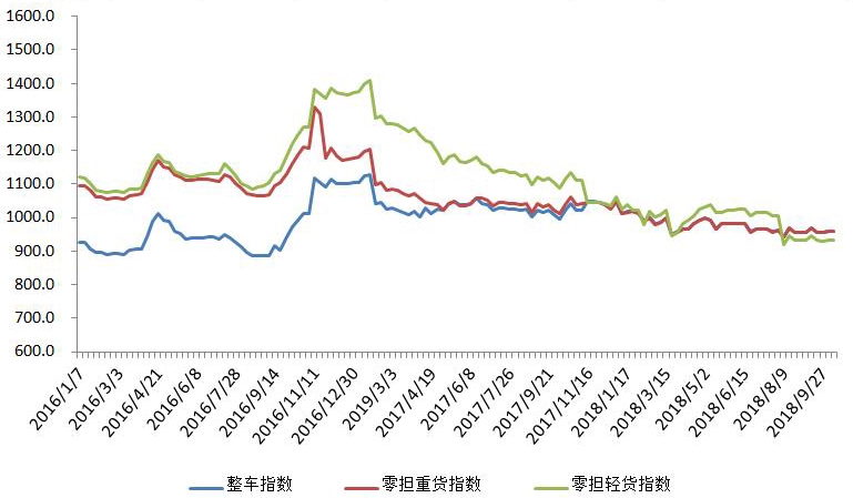 本周整车指数为958.18点,比上周回落0.01%;零担重货指数为957.95点,比上周回落0.01%;零担轻货指数为933.05点,比上周回落0.01%。