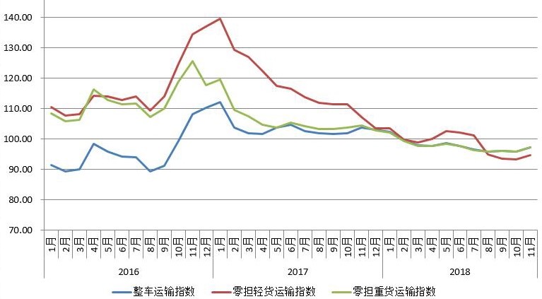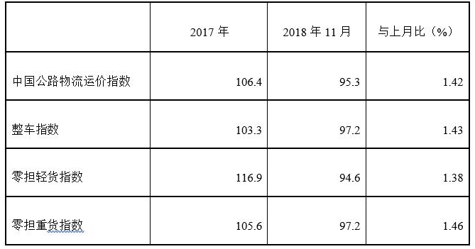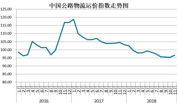 和林安物流集团联合调查的2018年11月中国公路物流运价指数为96.7点,比上月回升1.42%。