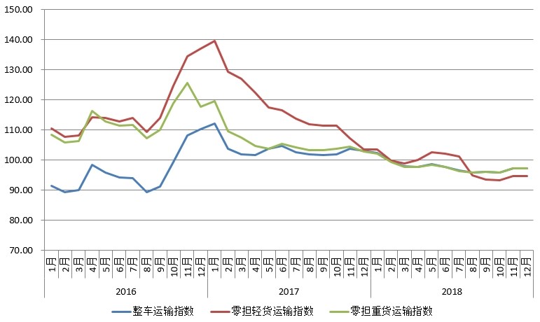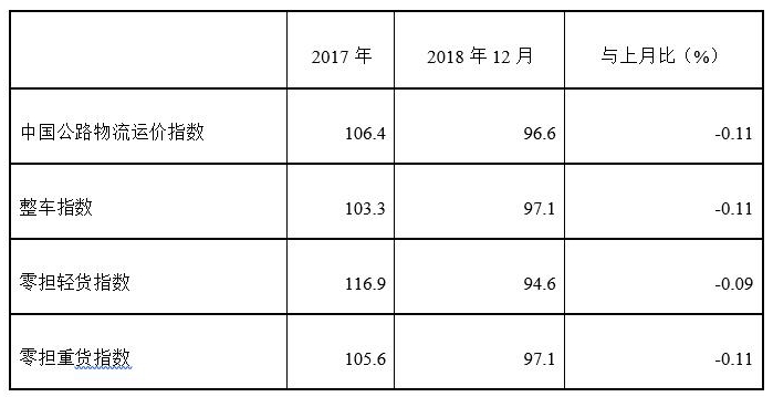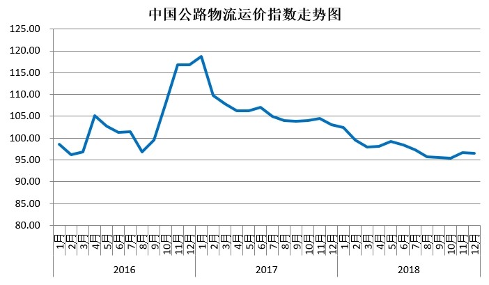 和林安物流集团联合调查的2018年12月中国公路物流运价指数为96.6点,比上月回落0.11%。本月月内指数波动幅度较小,第四季度指数呈现先回升后回落走势。