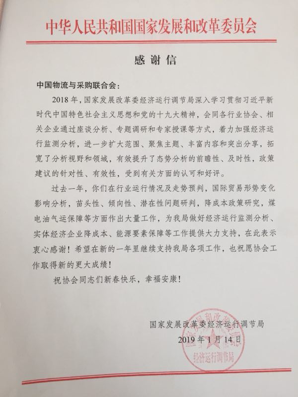 过去一年,你们在行业运行情况及趋势预测,国际贸易形势变化影响分析,苗头性、倾向性、潜在性问题研判,降成本政策研究,煤电油气运保障等方面作出大量工作,为我局做好经济运行监测分析、实体经济企业降成本、能源要素保障等工作提供大力支持,在此表示衷心感谢!希望在新的一年里继续支持我局各项工作,也祝愿协会工作取得新的更大成绩!
